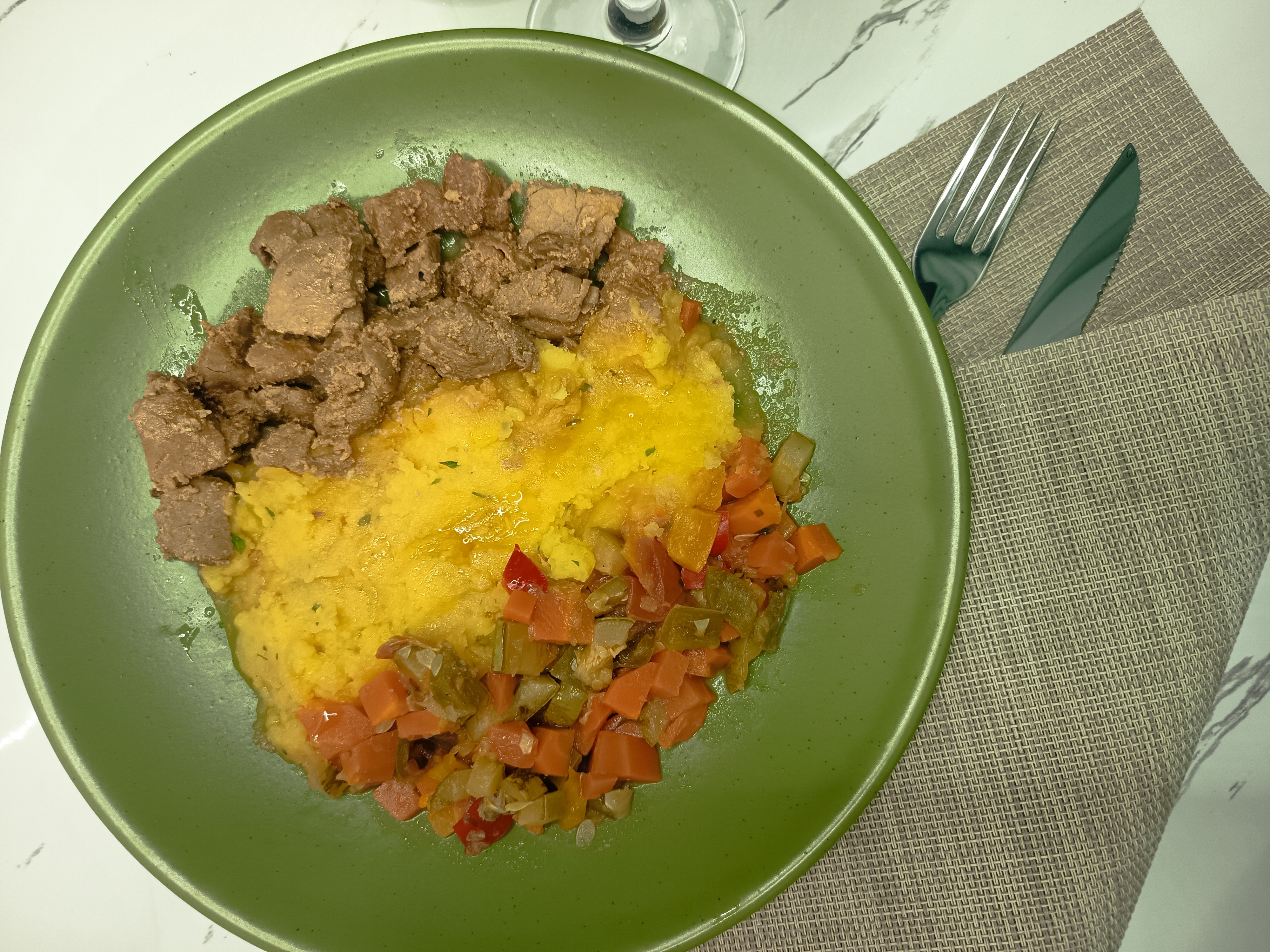 Mignon suíno ao tempero oriental com purê de batata salsa e legumes salteados.